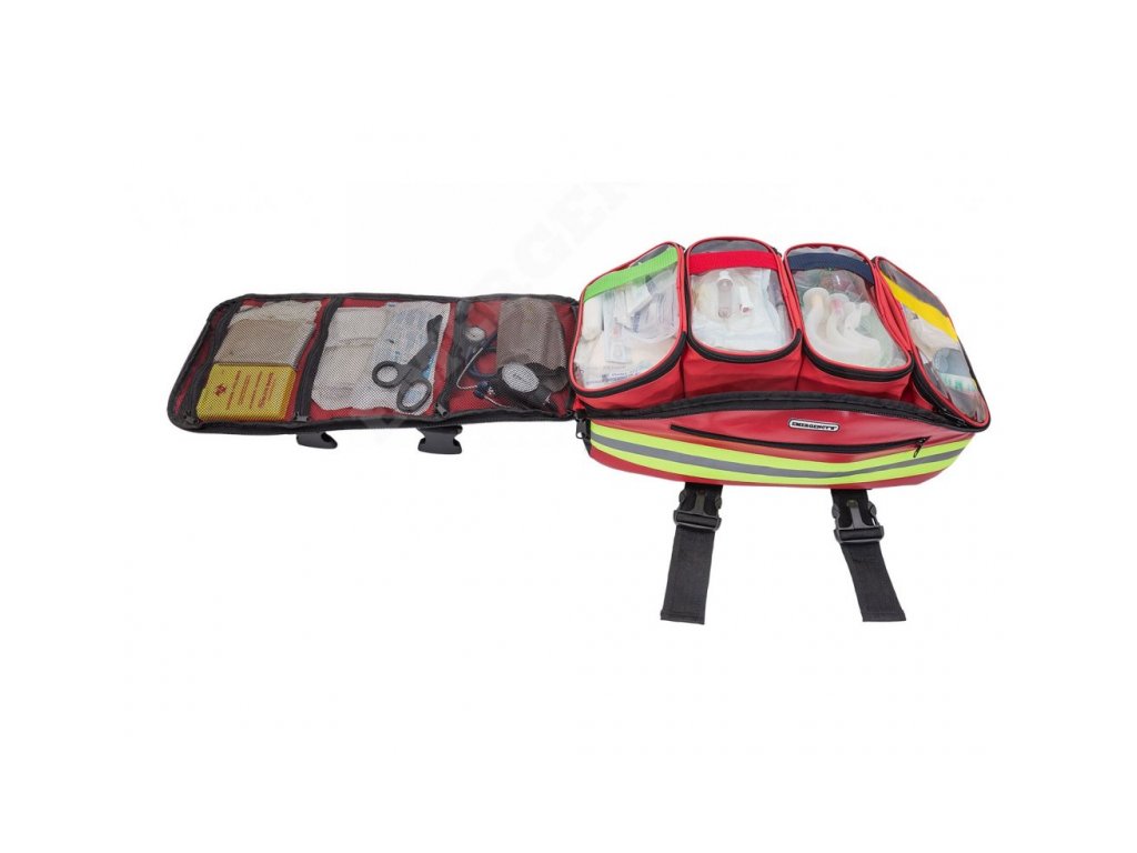 Brašnabatoh pre základnú záchranu života s lichobežníkovým tvarom, určený na vykonávanie záchranných prác alebo zásahov v rôznych situáciách, vrátane ťažko prístupných oblastí, hôr a/alebo stiesnených priestorov.